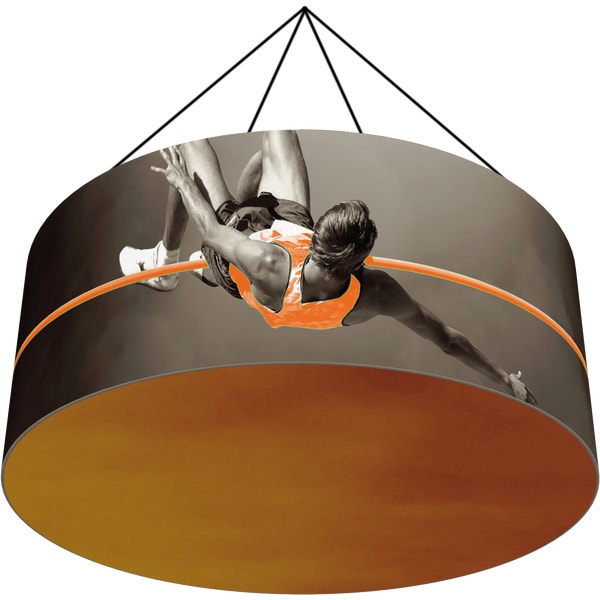 Make an impression with a 10 x 4Ft Formulate® Master Ring Hanging Structure. Manufactured and printed in the USA, construction is superior and built to last and reuse. Zipper pillowcase stretch fabric graphics are coupled with lightweight aluminum tube structures to deliver impactful messaging from above. Graphics are durable and dry-cleanable.