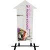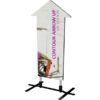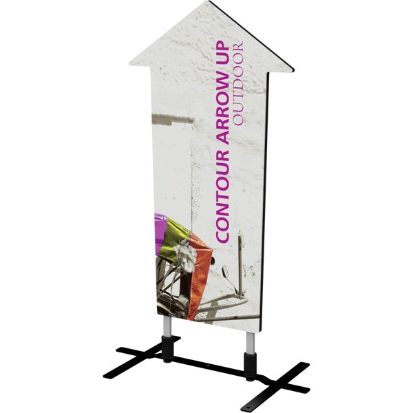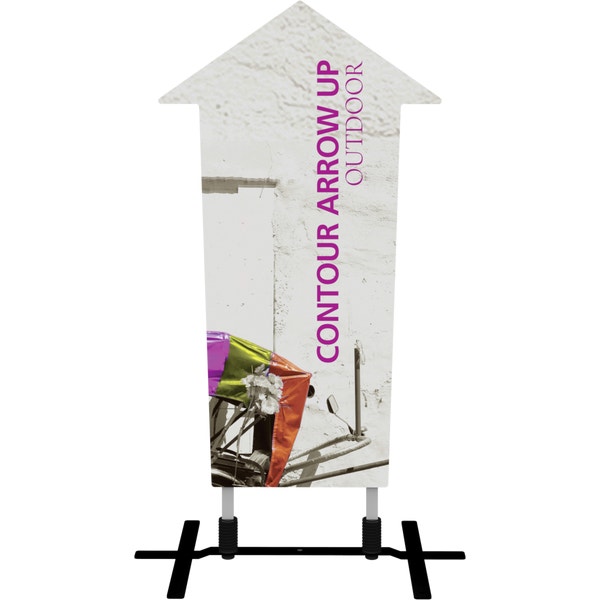 The Contour Arrow Up with steel plate base is a heavy-duty double-sided sign that utilizes hook and loop connections to make graphic changes quick and simple. The discreet plate base comes with four ground stakes for added stability.