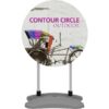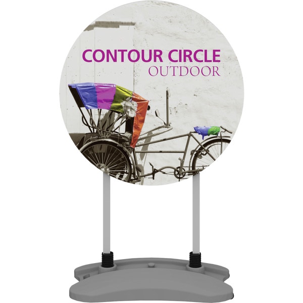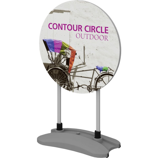 The Contour Circle with water base is a heavy-duty double-sided sign that utilizes hook and loop connections to make graphic changes a breeze. The compact, molded water base features integrated wheels and a handle for easy transportation and can be filled with either water or sand for added stability.