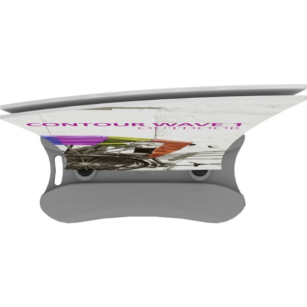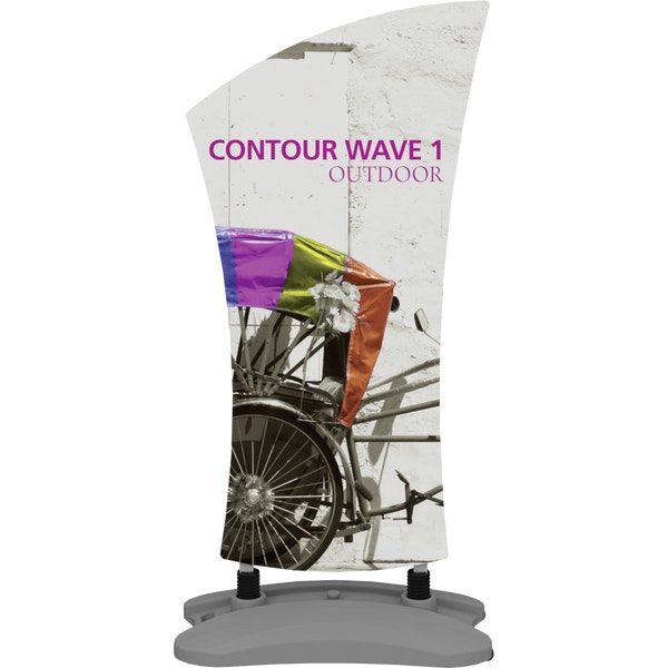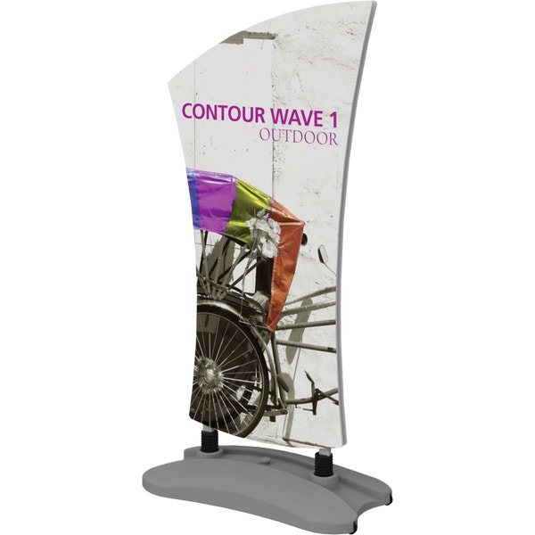 The Contour Wave 1 with water base is a heavy-duty double-sided sign with sweeping lines that utilizes hook and loop connections to make graphic changes a breeze. The compact, molded water base features integrated wheels and a handle for easy transportation and can be filled with either water or sand for added stability.