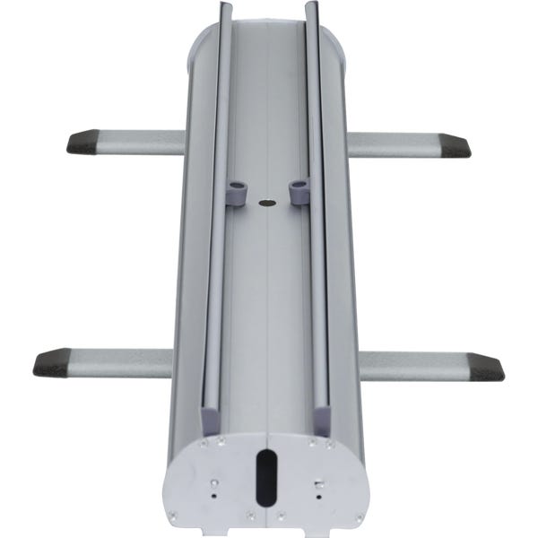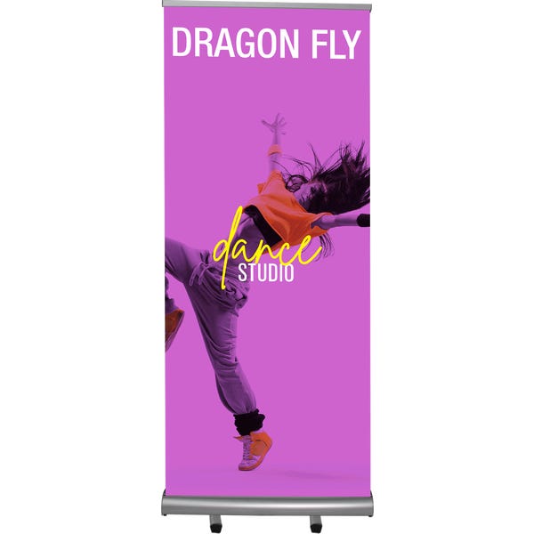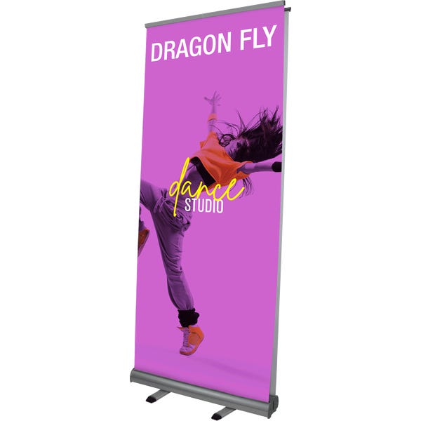 Dragon Fly is a double-sided roller banner stand with sturdy base and bungee pole. This banner stand is very compact and features a sleek silver base with swivel feet for stability. Graphic width measures 33.25″, with graphic height measuring at 79″.