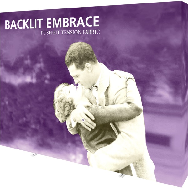 The Embraceâ„¢ 10ft full height (4 Quad x 3 Quad) backlit push-fit fabric display is a sleek illuminated collapsible display. The Backlit Embrace makes it simple to make a big impact in minutes with easy-to-attach patent-pending LED lighting and a push-fit backlit graphic that attaches to channel bars around the perimeter of the frame. Simply attach lights to the collapsible frame and insert the graphic into the channel bars for an impactful illuminated display solution! Graphics available as single or double-sided with endcaps. No tools are required for assembly. A protective molded case for storage and transport are included. Option available to purchase frame, LED lights and case only..