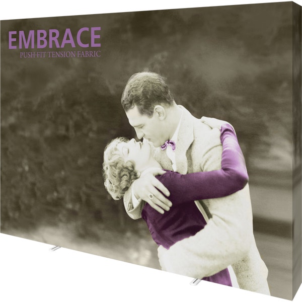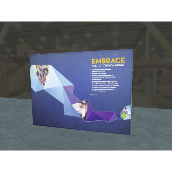 Embraceâ„¢ 10ft full height (4 Quad x 3 Quad) is a sleek, collapsible, portable tabletop display that delivers style with minimal effort. Embrace 10ft full height (4 Quad x 3 Quad) features a sleek, collapsible anodized silver frame with channel bars that hold push-fit fabric graphics offered with or without endcaps. No tools are required for assembly. The lightweight and highly portable display packs away as easily as it sets up for the ideal tradeshow, event or retail display!