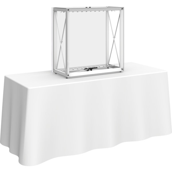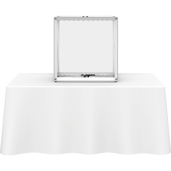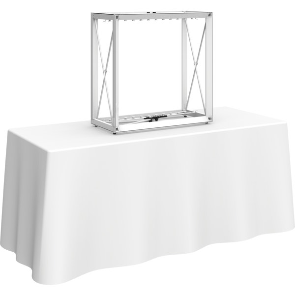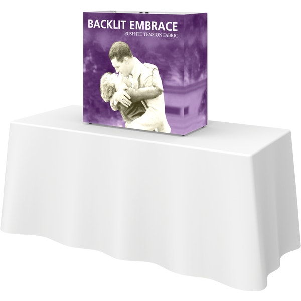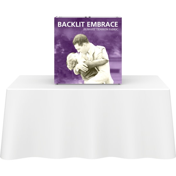 The Embraceâ„¢ 2.5ft tabletop (1 Quad x 1 Quad) backlit push-fit fabric display is a sleek illuminated collapsible display. The Backlit Embrace makes it simple to make a big impact in minutes with easy-to-attach patent-pending LED lighting and a push-fit backlit graphic that attaches to channel bars around the perimeter of the frame. Simply attach lights to the collapsible frame and insert the graphic into the channel bars for an impactful illuminated display solution! Graphics available as single or double-sided with endcaps. No tools are required for assembly. A protective molded case for storage and transport are included. Option available to purchase frame, LED lights and case only.