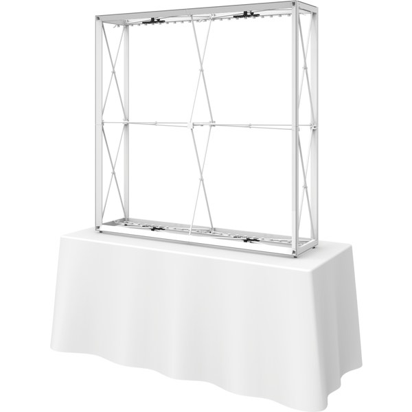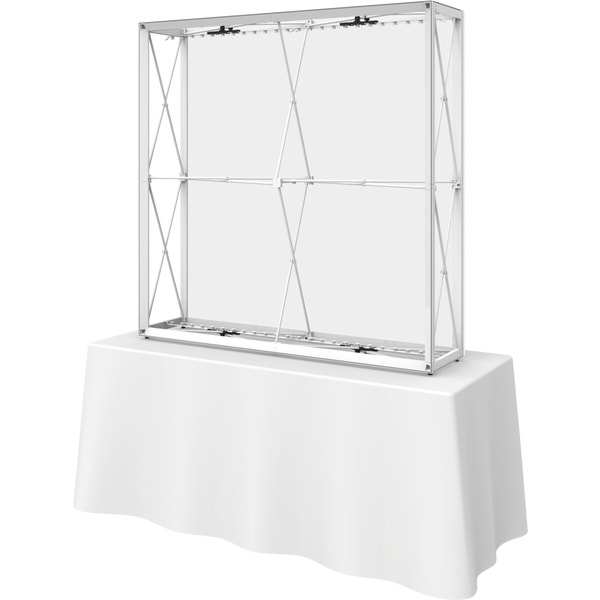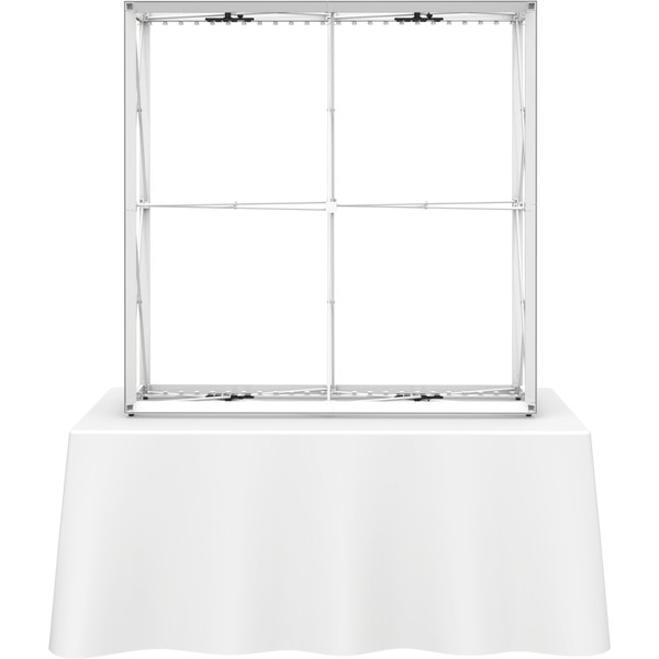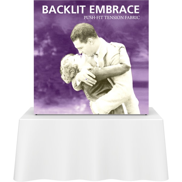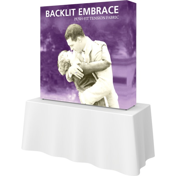 The Embraceâ„¢ 5ft tabletop (2 Quad x 2 Quad) backlit push-fit fabric display is a sleek illuminated collapsible display. The Backlit Embrace makes it simple to make a big impact in minutes with easy-to-attach patent-pending LED lighting and a push-fit backlit graphic that attaches to channel bars around the perimeter of the frame. Simply attach lights to the collapsible frame and insert the graphic into the channel bars for an impactful illuminated display solution! Graphics available as single or double-sided with endcaps. No tools are required for assembly. A protective molded case for storage and transport are included. Option available to purchase frame, LED lights and case only.