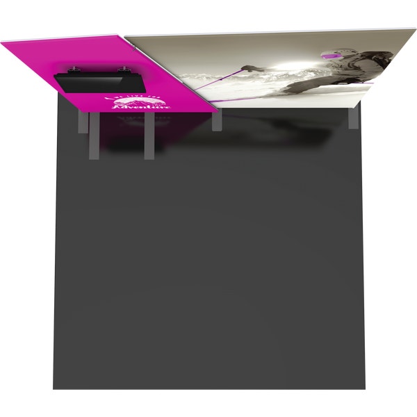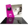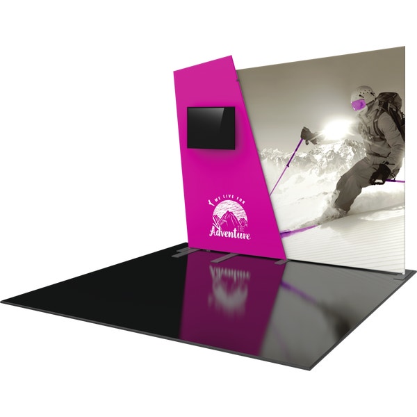 Formulate® Designer Series 10ft Fabric backwall Kit 07 is sleekly designed exhibit that includes two aluminum tube frames featuring spigot connections, a kiosk supporting a medium monitor mount for multimedia display and simple pullover zipper pillowcase fabric graphics. Designer Series Kit 07 comes in two portable, expandable wheeled transit cases for easy storage and transport. Assembly and graphic attachment is easy – simply pull the pillowcase fabric graphics over the frame and zip.