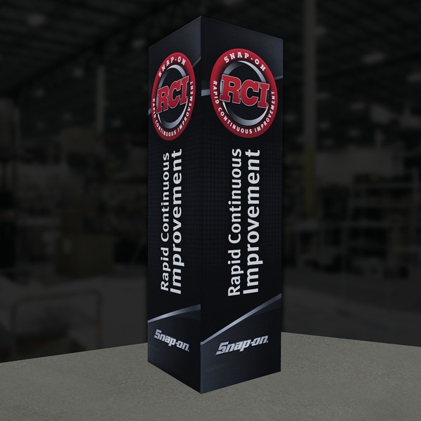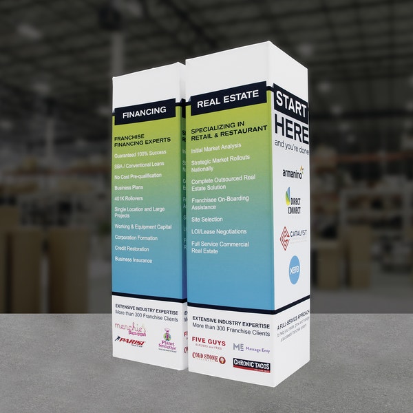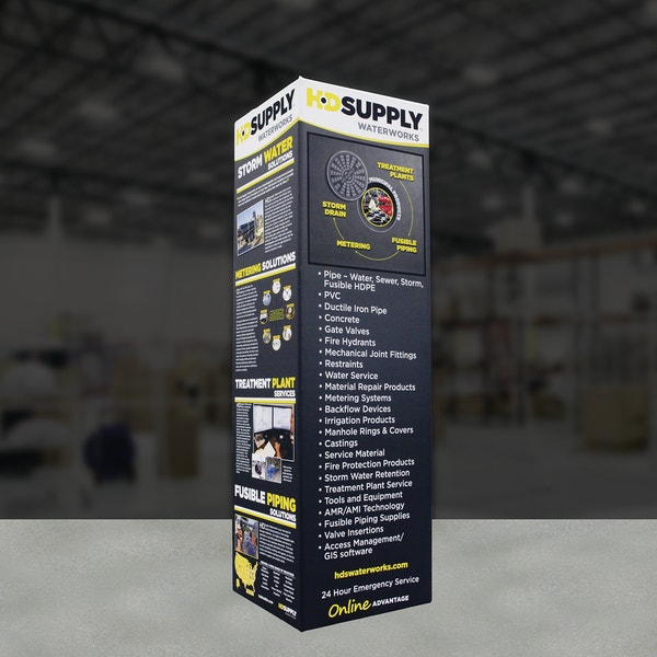The Formulate® 10ft Four Sided Fabric Tower 02 can transform any environment through form, fabric and lighting. The rectangular-shaped tower is 10ft tall and 3ft square at the top and bottom. Formulate Four Sided Fabric Tower 02 combines the latest developments in fabric printed technology with aluminum tube frames to add dimension, decor and sculpture to any event, stage set, tradeshow booth or interior space. Simply mix and match with other Formulate towers to add architecture and drama to any event or interior space. Formulate Tower 02 accommodates internal LED lighting (sold separately) to create a glowing effect. Four Sided Tower 02 packs easily into a wheeled OCL case for easy storage and transport.