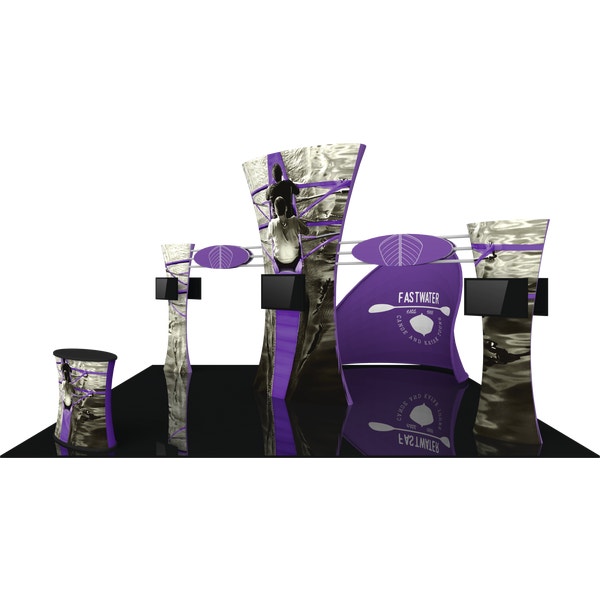 – Kit includes: fabric center tower structure, two side fabric tower structures, rigid graphic accents, chip wall conference wall, oval counter, five monitor mounts and 1 woodcrate