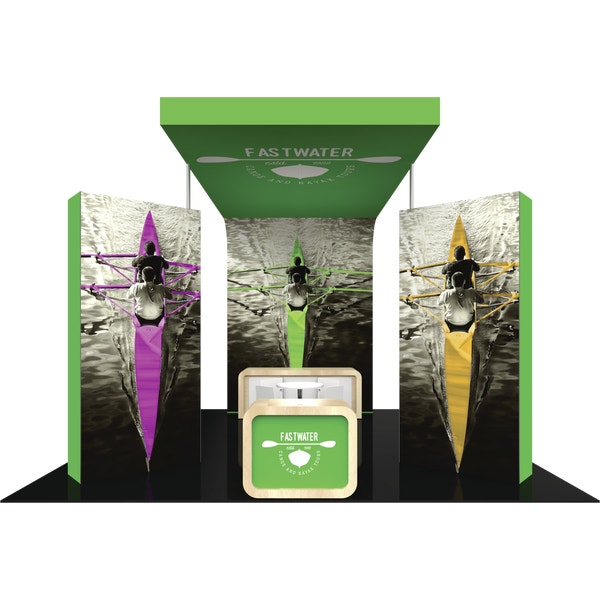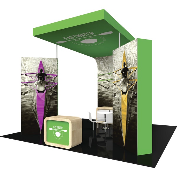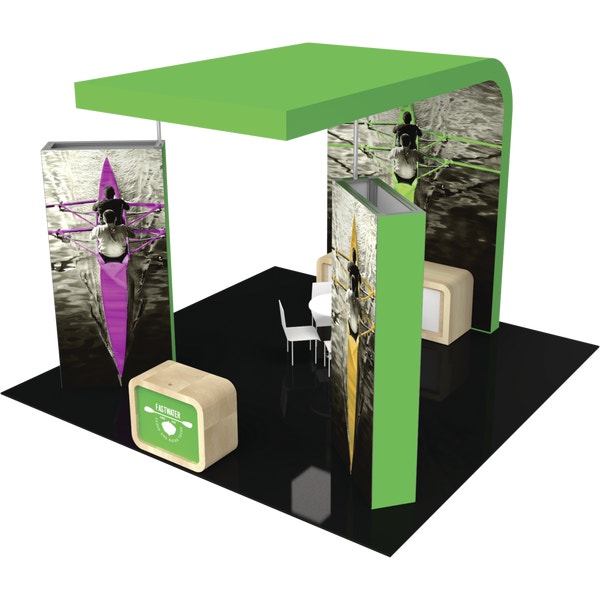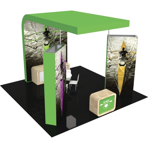 – Two double-sided fabric graphic walls set at a 45 degree angle