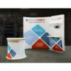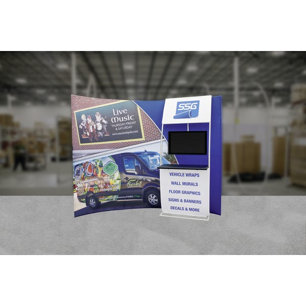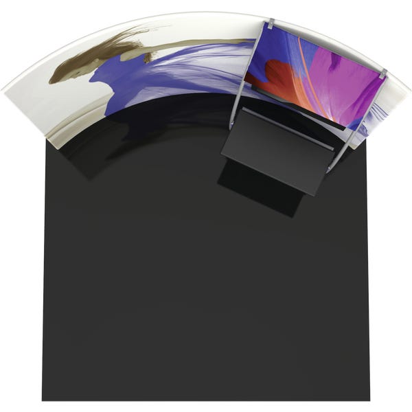 The Formulate® 10ft Horizontal Curve 6 Tension Fabric Display combines style and functionality with its highly portable aluminum tube frame and striking custom fabric graphics. This display features an accent ladder with fabric graphics, top and bottom, as well as a wide counter area and a monitor mount designed for a medium monitor display. Stretch fabric graphics are hand-sewn, durable and dry-cleanable.