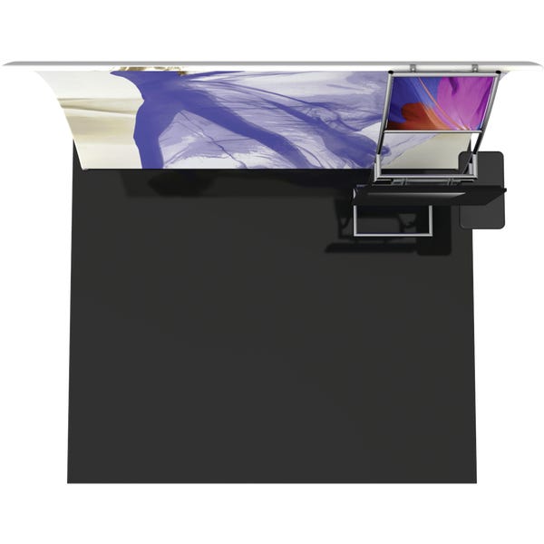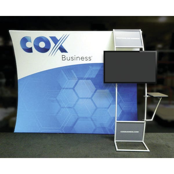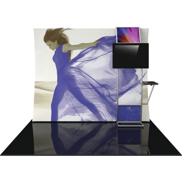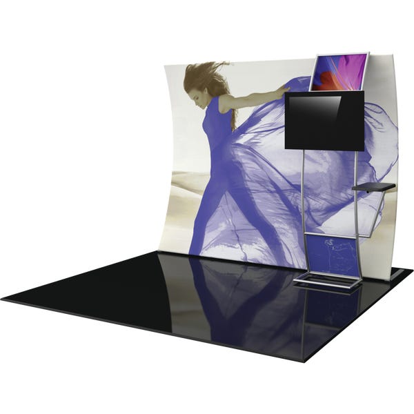 The Formulate® VC9 Vertical Curve 10ft Fabric Display is a modern, versatile stretch fabric display. The durable frame is constructed from lightweight aluminum tubing that is easy to set up, and high-quality, hand-sewn pillowcase graphics pull over the display and zip up. This exhibit kit features a stand-off monitor mount, allowing for stylish presentations and digital demonstrations, as well as a small accent table.