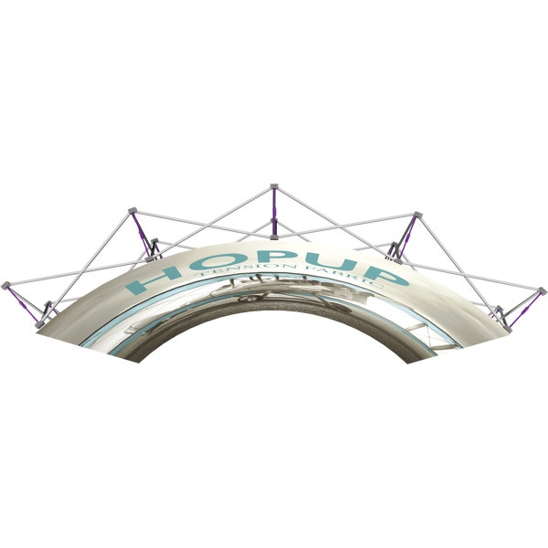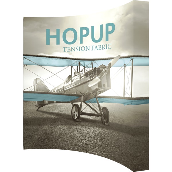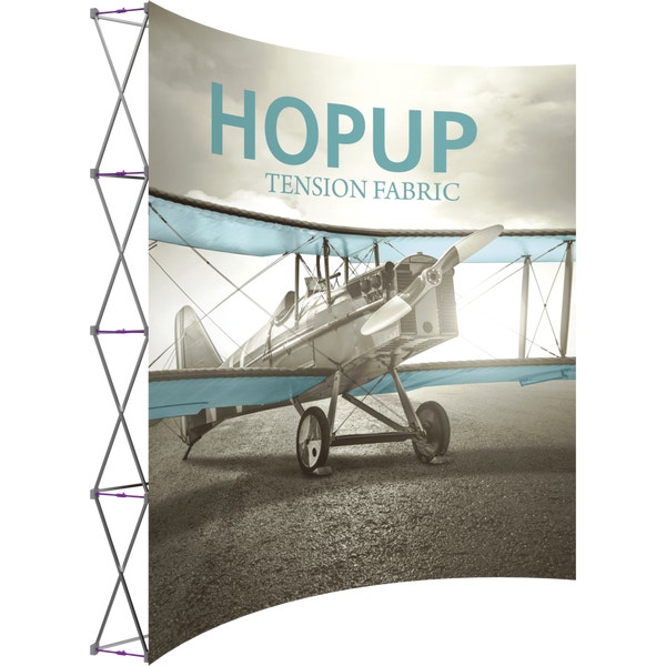 Hopupâ„¢ 10ft (4 quad x 4 quad) curved pop up display is a towering, dynamic display that provides both dimension and visibility. The display measures 10ft in height, yet sets up in seconds with its lightweight, collapsible frame. The Hopup is a fast, affordable, portable display solution that features high-quality graphics and exceptional ease of use. Option available to purchase frame separately.