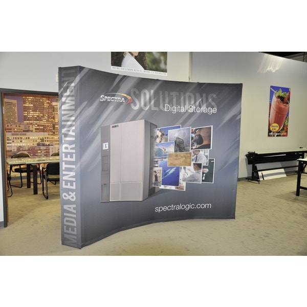 The Hopupâ„¢ 10ft (4 quad x 3 quad) curved full height tension fabric display provides a versatile display solution. This pop up booth is features a lightweight frame that is easy to ship, set up and take down, resulting in unmatched portability and ease of use. Optional end caps are available. High-quality, custom graphics are pre-attached to the frame using hook and loop; simply expand the display and set up is done in seconds, no tools required! Wheeled storage/shipping bag is included.