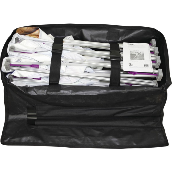 When it comes to portability, versatility and ease of use, few displays can match the Hopupâ„¢ 10ft (4 quad x 3 quad) straight pop up display. This tension fabric display sets up in seconds, creating a dynamic appearance that can be used in a wide variety of exhibits and environments. The graphic is pre-attached, making assembly fast and simple. Included is a wheeled shipping bag to make transportation quick and easy. Lightweight, aluminum frame can be purchased separately.