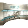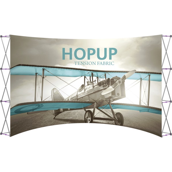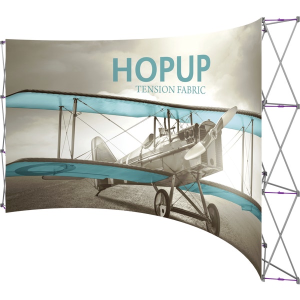 Hopupâ„¢ 15ft (6 quad x 3 quad) curved full height tension fabric display utilizes a curved fabric mural to prominently display your design and messaging. Optional endcaps are available for the 15ft portable display, which is lightweight and easy to set up with its expanding frame and hook and loop pre-attached fabric graphics. In a large number of display settings, the Hopup is the perfect option for your needs whether as a solo display or as part of a large scale exhibit. A wheeled carry bag is included for easy transportation.