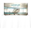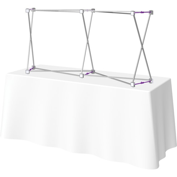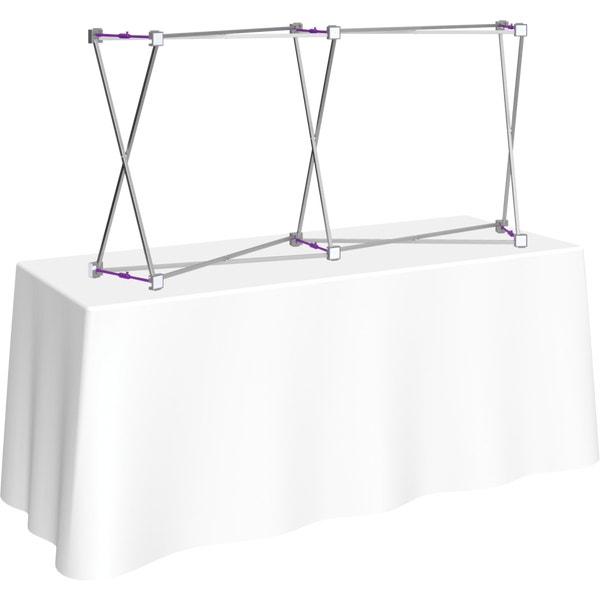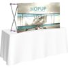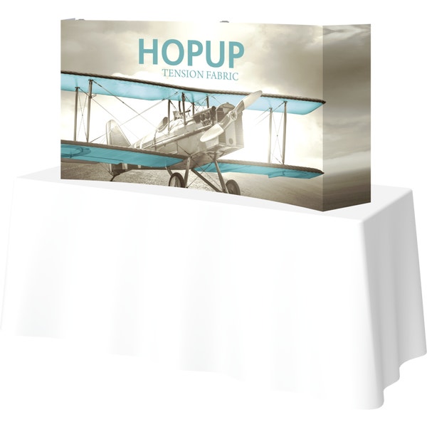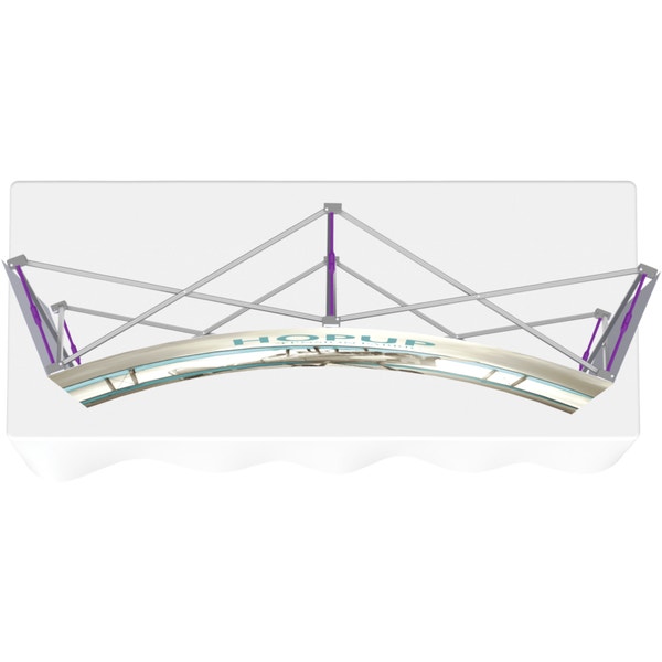 Hopupâ„¢ 5ft (2 quad x 1 quad) curved tabletop pop up display is a dynamic display, perfect for adding messaging to exhibits. Any table becomes an opportunity to further add branding and custom graphics with this portable pop up display that sets up in seconds with no tools required! The graphics are pre-attached to the lightweight aluminum frame via hook and loop. A rolling carry bag is included to make shipping and storage hassle-free.