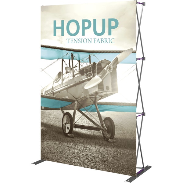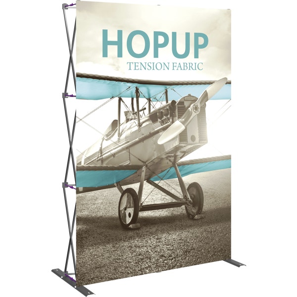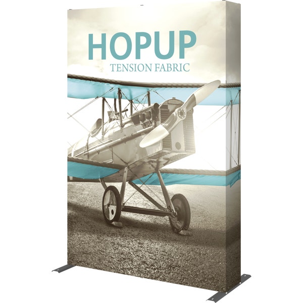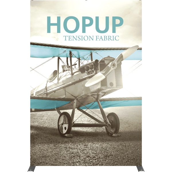 Hopupâ„¢ 5ft (2 quad x 3 quad) straight full height tension fabric display is a highly portable display solution. Hopup 2×3 Straight features a lightweight, durable aluminum frame and a pre-attached, hook and loop-applied straight fabric graphic. Simply attach the graphic, pop (expand) the frame and you have a perfect full height display, no tools are required for assembly! A rolling carry bag for storage and transport is included. Option available to purchase the frame only.