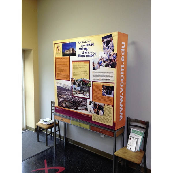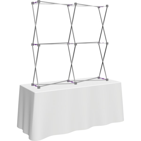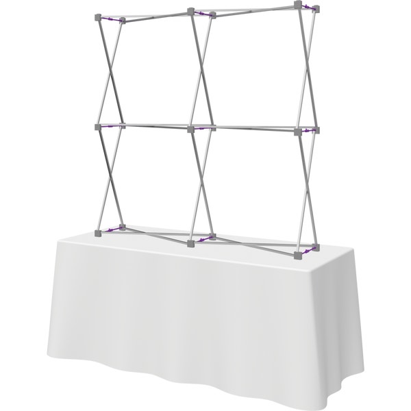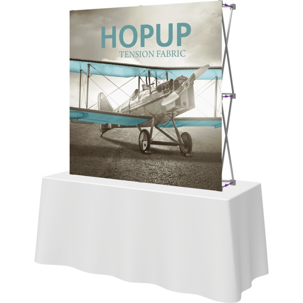 Hopupâ„¢ 5ft (2 quad x 2 quad) is a 5x5ft tabletop display that provides versatility and portability. The square display features a sturdy aluminum pop up frame that is lightweight and sets up in seconds, combined with pre-attached hook and loop custom graphics. Expand the frame and you have a tabletop display ready to go, with take down and storage just as simple! Assemble without tools. Included is a wheeled shipping and storage back for additional ease of use.