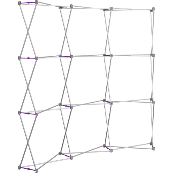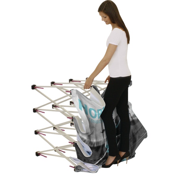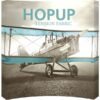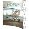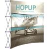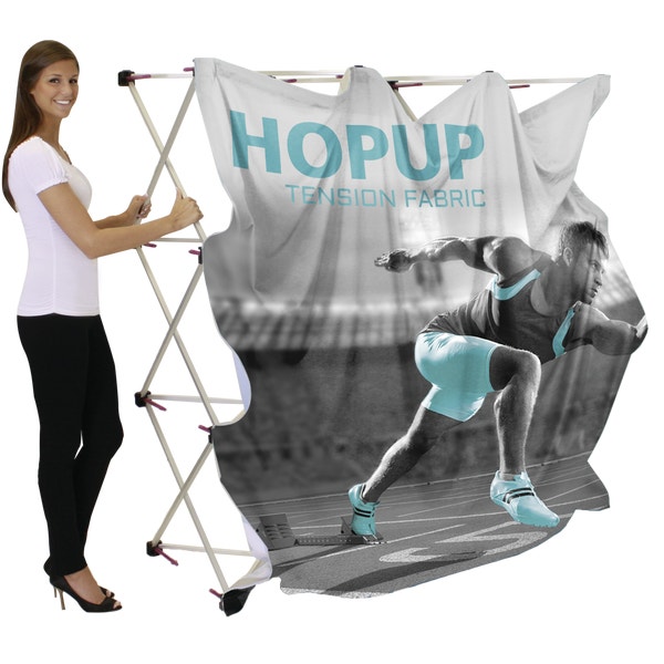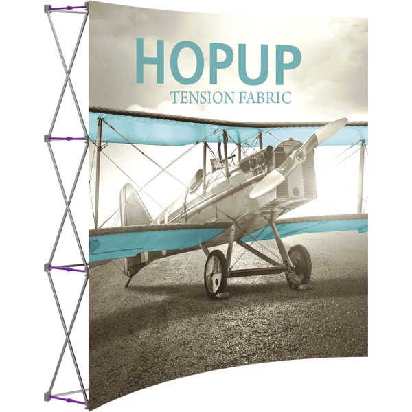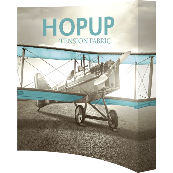 Hopupâ„¢ 7.5ft (3 quad x 3 quad) curved full height pop up display is the portable solution with incredible versatility. Hopup 3×3 curved features a lightweight, durable aluminum frame and a pre-attached hook and loop-applied, curved fabric mural with or without endcaps. Simply pop (expand) the frame and you have a perfect full height display; no tools are required for assembly! A rolling carry bag for storage and transport is included. Option available to purchase the frame only.