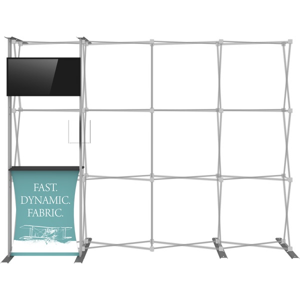 Hopupâ„¢ tension fabric backwall Accessory Kit 03 is an easy way to add style, flair and function to any 10ft wide straight Hopup display. Accessory Kit 03 includes an accessory counter with monitor mount, printed fabric graphic and literature pocket. The accessory counter and monitor mount provide extra real estate for messaging. Accents quickly attach to any 10ft Hopup for a no-stress display. Dimensional elements can be placed in the middle, left or right sides of the display. Backwall is not included.