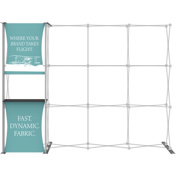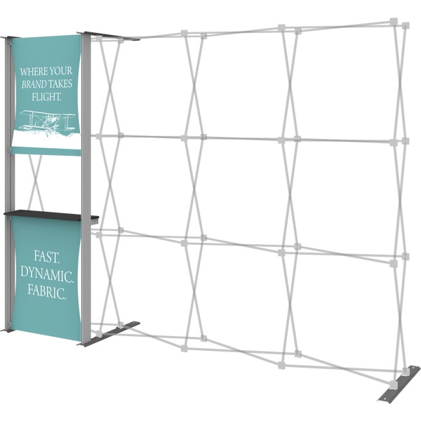 Hopupâ„¢ tension fabric backwall Accessory Kit 04 is an easy way to add style, flair and function to any 10ft wide straight Hopup display. Accessory Kit 04 includes an accessory counter with monitor mount, printed fabric graphic and literature pocket. The accessory counter and monitor mount provide extra real estate for messaging. Accents quickly attach to any 10ft Hopup for a no-stress display. Dimensional elements can be placed in the middle, left or right sides of the display. Backwall is not included.