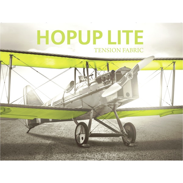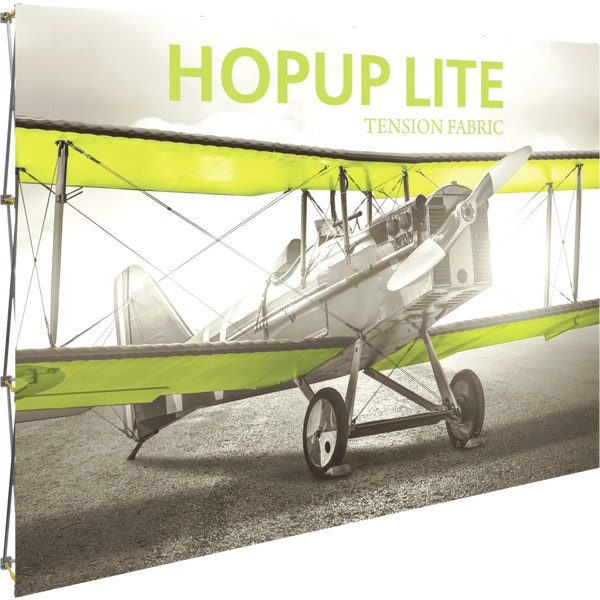 Hopupâ„¢ Lite 10ft (4 quad x 3 quad) straight full height tension fabric display features a lightweight, economy aluminum frame that is easy to set up. The hook and loop-applied, straight fabric mural with or without endcaps pre-attaches to the frame. For a quick and easy full height economy display, simply attach the graphic, pop (expand) the frame and go – no tools are required for assembly! A carry bag for storage and transport is included.