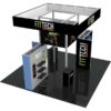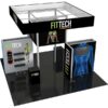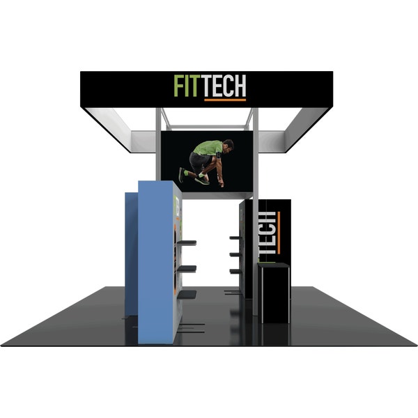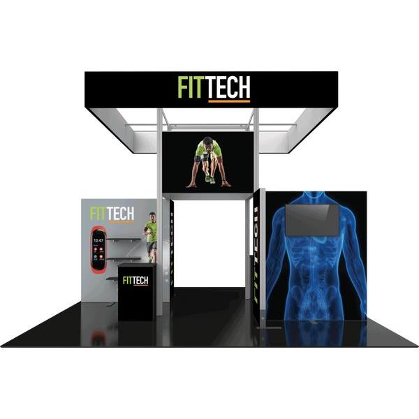 – Floor based backwalls feature push-fit fabric graphics; monitor mounts and shelves