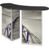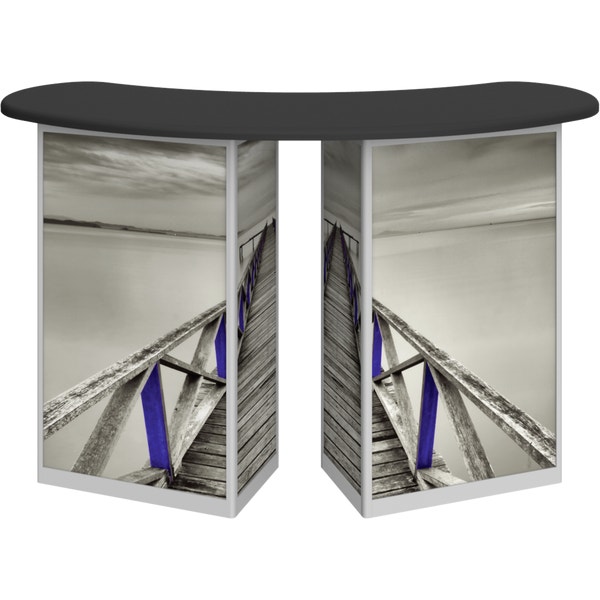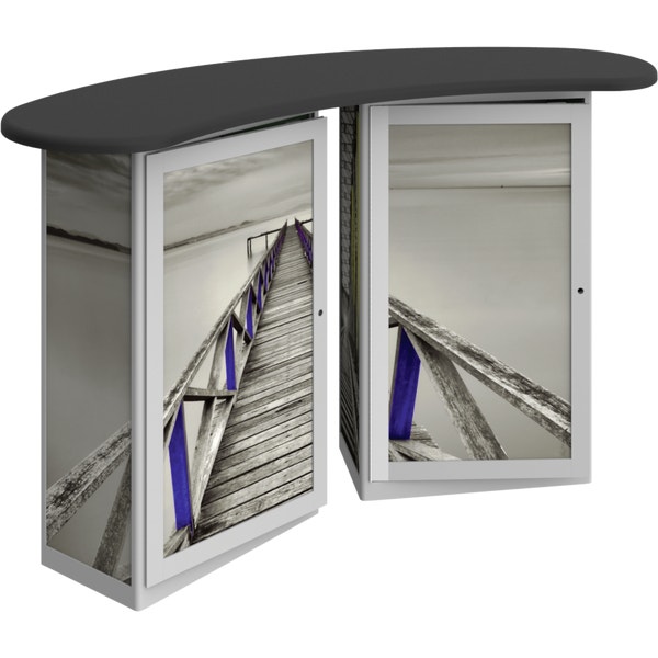 Combining durable, lightweight extrusion with printed graphic panels, Linearâ„¢ Double Reception Counter features two rectangular counters connected with an arching countertop, locking storage cabinets and internal shelving.