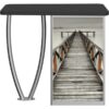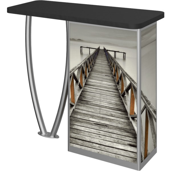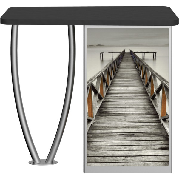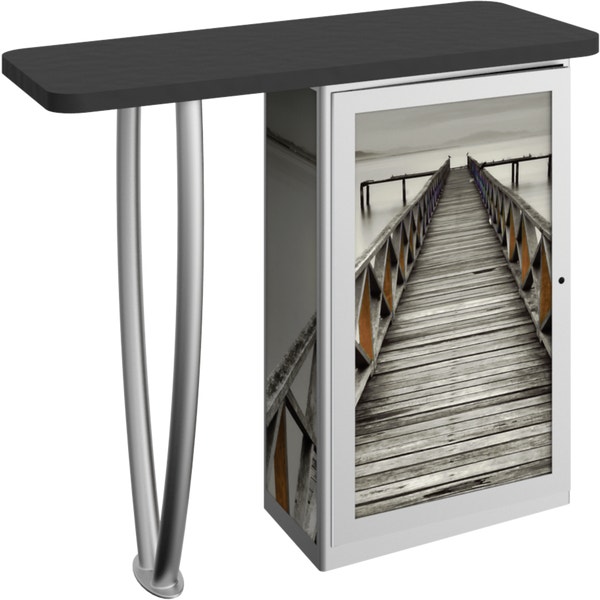 Combining durable, lightweight extrusion with printed graphic panels, Linearâ„¢ Tusk-Leg Counter features an “tusk” shaped leg complementing a rectangular cabinet column, internal shelving and locking cabinet door.