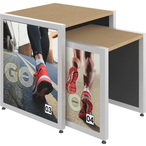 The MODify Nesting Table 03 is a perfect addition to any space. The sturdy metal frame provides excellent support and stability, while the elegant wooden tabletops add a touch of warmth and sophistication to any room. SEG push-fit fabric graphics are fantastic options for each side, and provide a creative way to show branding, messaging and color. MODify Nesting Table 03 slides over Nesting Table 04; the nesting feature makes the tables versatile and the sleek design makes them ideal for any space.