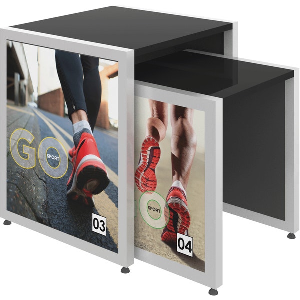 The MODify Nesting Table 04 is a perfect addition to any space. The sturdy metal frame provides excellent support and stability, while the elegant wooden tabletops add a touch of warmth and sophistication to any room. SEG push-fit fabric graphics are fantastic options for each side, and provide a creative way to show branding, messaging and color. MODify Nesting Table 04 slides underneath Nesting Table 03; the nesting feature makes the tables versatile and blends both style and function.