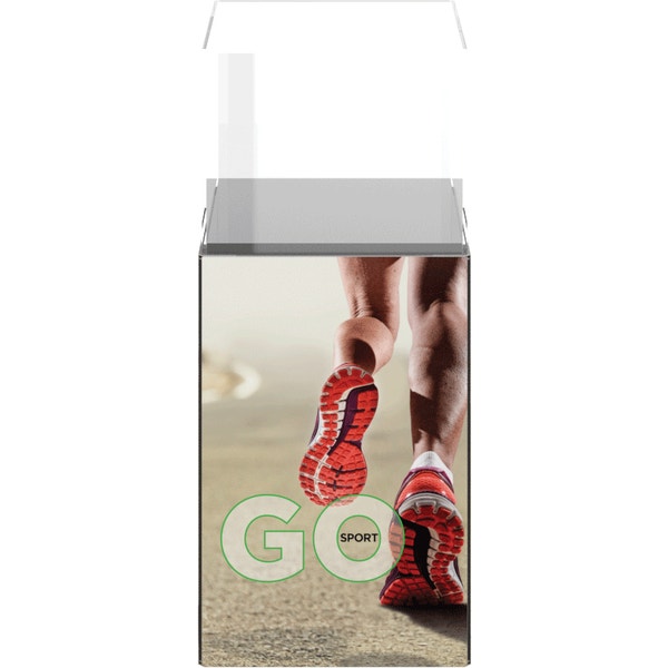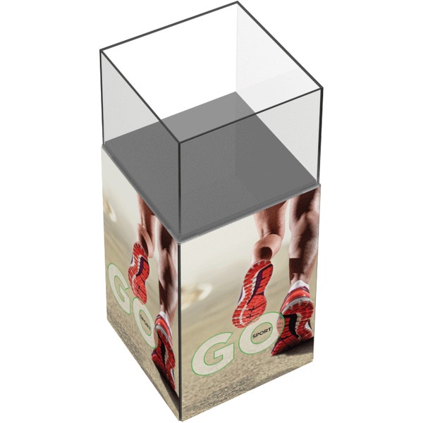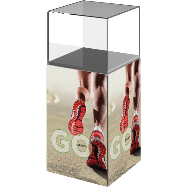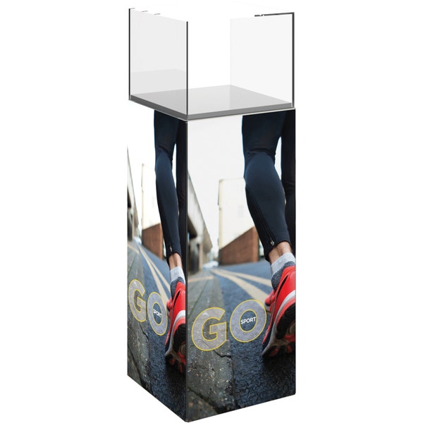 The MODify Pedestal 01A is designed to help highlight merchandise and branding/messaging. The base consists of four aluminum frames that hold SEG push-fit graphics. A wood platform sits on top of the base. An abraisian-resistant acryclic topper highlights merchandise in a special way.