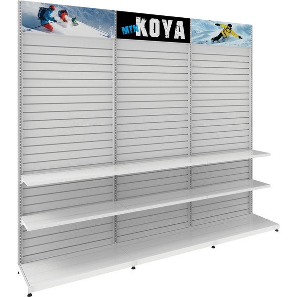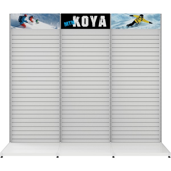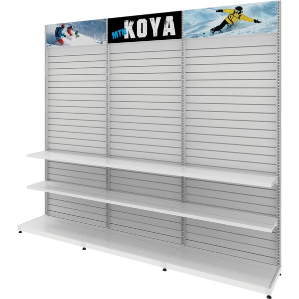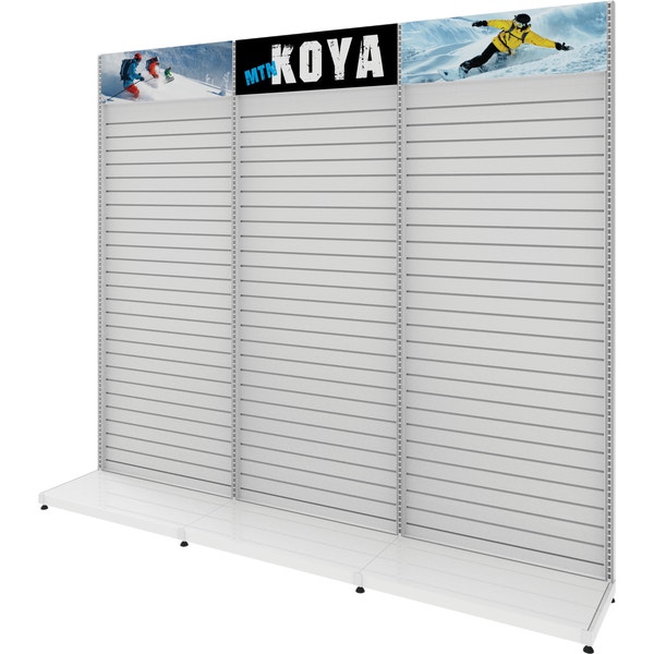 MODify Single Sided Kit 04 is a versatile retail display solution that consists of three slatwall panels, each featuring push-fit graphic headers. With this kit, you can easily personalize and MODify it by incorporating various fixtures or furniture, allowing you to highlight your products in a way that best suits your needs.