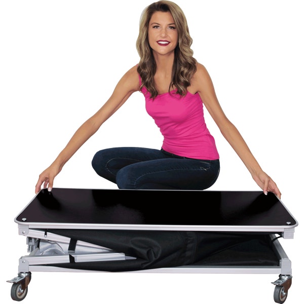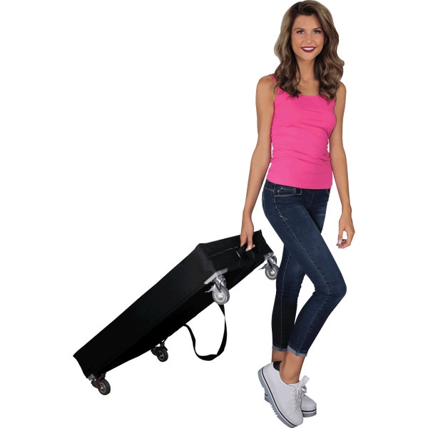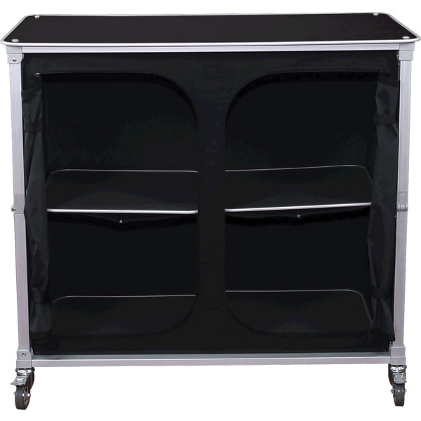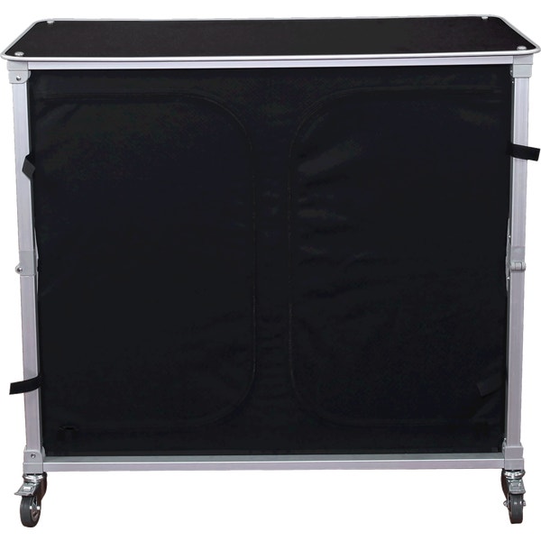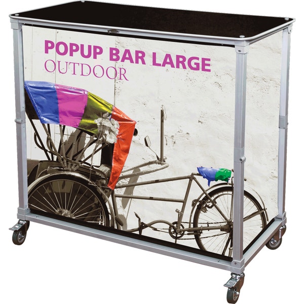 The Large portable Popup Bar is an expandable, wheeled sampling and serving station perfect for any event, indoor or outdoor! The pre-assembled aluminum frame comes together by unfolding the legs, and inserting the interior shelf panels. Fully-customized fabric graphics on the front and sides will win visitors over as you provide an effortless serving experience.