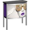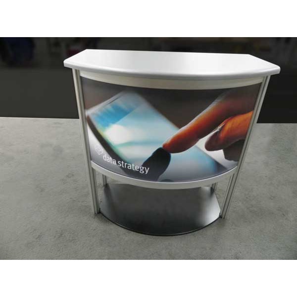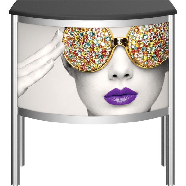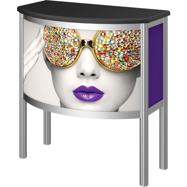 Vector Frameâ„¢ Counter 05 complements the Vector Frame series of exhibit kits, and is also ideal for any stand-alone event or display. Vector Frame Counter 05 combines simple extrusion-based frames and rigid graphics. The back of the counter features a locking door with a blank infill and provides access to interior storage space. Tabletops available in four color finish options.