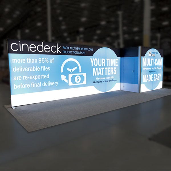 Vector Frameâ„¢ fabric light box Rectangle 07 spans near 20ft wide and features a durable 100mm aluminum extrusion frame, one large, seamless push-fit backlit fabric graphic and LED edge lighting. Single and double-sided graphic options are available. LED lights come adhered to the frame, making set-up as simple as assembling the frame, applying the push-fit graphics and plugging in the electrical cord! Vector Frame Light Box R07 is ideal for use in retail, event, corporate and trade show environments as an illuminated messaging solution.