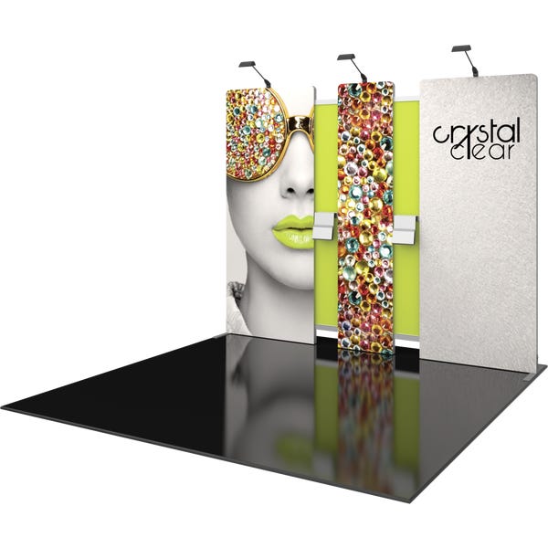 – Kit includes frame, three fabric graphic panels, four rigid graphic accents, two literature pockets, three 120 watt lights, and one wheeled molded case