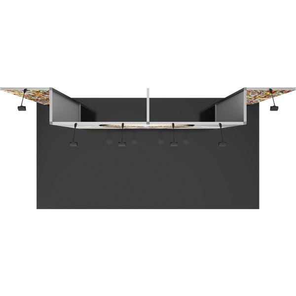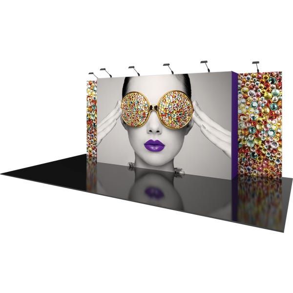 – Kit includes frame, nine fabric graphics, six 120 watt floodlights, and two wheeled molded cases