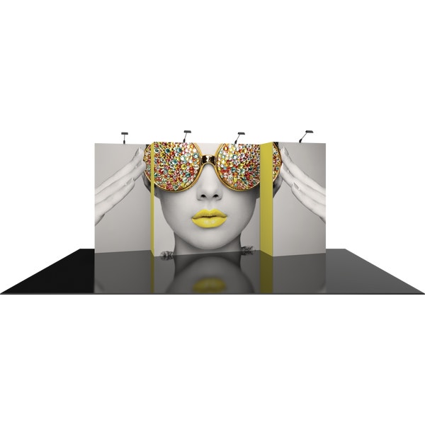 – Kit includes frame, five fabric graphic panels, four rigid graphic wing accents, four 120 watt lights, four literature pockets and two wheeled molded cases