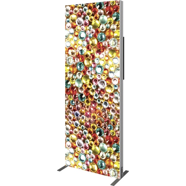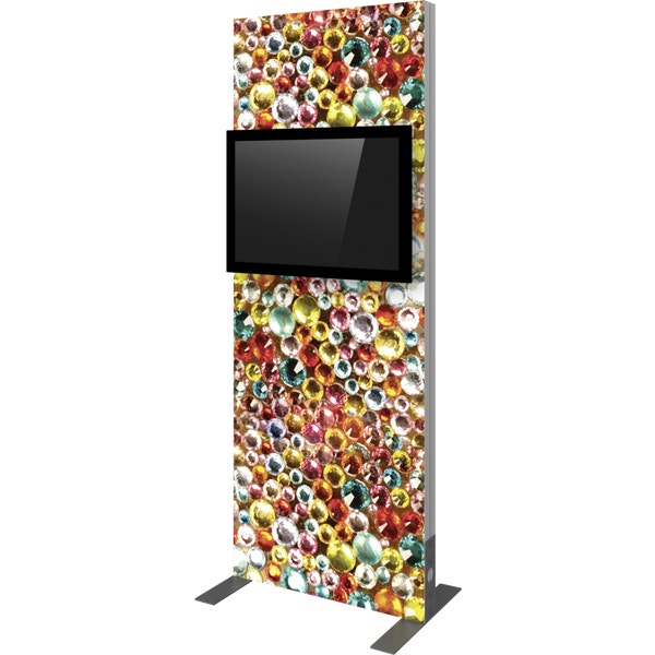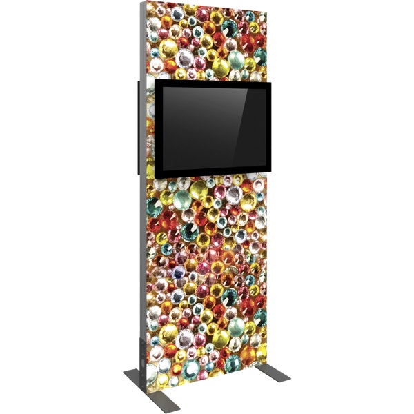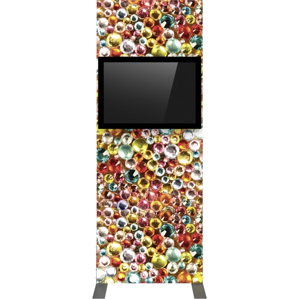 Vector Frameâ„¢ single-sided monitor kiosk 01 is a sleek, stylish way to display media at any trade show, event, in a retail or corporate space. Featuring a single or double-sided printed push-fit fabric graphic, easy to assemble 100mm (4in) aluminum extrusion frame and a single monitor mount, this kiosk is an ideal multimedia display solution. Pair with a complementary Vector Frame banner, backwall, exhibit kit or counter for a complete solution.