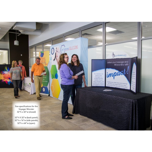 The Voyagerâ„¢ Monster has been specially developed as an briefcase style, tabletop display and is a great choice for promotions on the go. It measures 64in wide and 32in high when open, and has a rigid, thermos-formed ABS exterior and a black, Hook and loop compatible fabric interior. Optional detachable 22mil PVC graphics and header panels available. Extra graphics can be stored in the display and packed away for easy storage. Voyager Monster has a lifetime hardware warranty against manufacturer defects.
