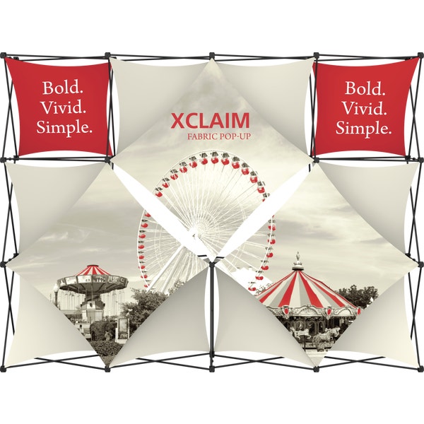Xclaim 10ft wide (4 Quad x 3 Quad) Kit 05 is a versatile stretch fabric popup display. Add dimension to your event or tradeshow with unique, exciting graphic styles. Xclaim 10ft wide (4 Quad x 3 Quad) Kit 05 is easy to setup, lightweight and portable. The collapsible popup frame is fully magnetic (with magnetic linking connectors), making it simple to assemble and disassemble. Stretch fabric graphics come pre-attached to the frame, making assembly easy and fast. Graphics adhere to the hubs using push-fit attachment technology. Xclaim 10ft wide (4 Quad x 3 Quad) Kit 05 comes with graphics, frame and soft case with a shoulder strap.