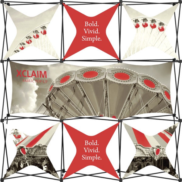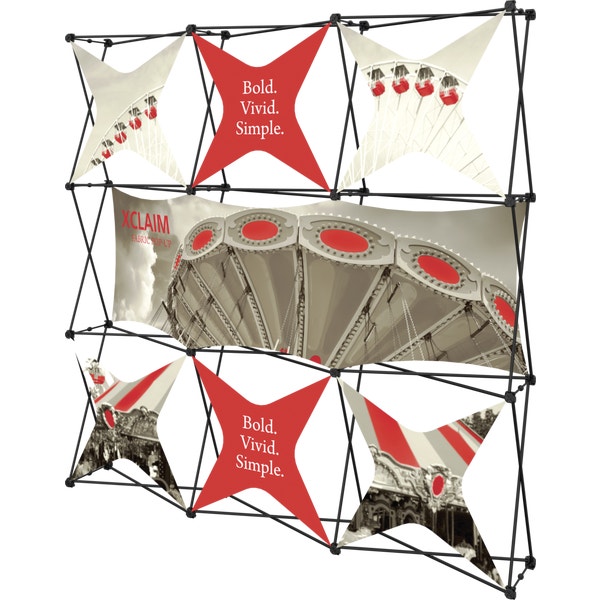 Xclaim 8ft wide (3 Quad x 3 Quad) Kit 06 is a versatile stretch fabric popup display. Add dimension to your event or tradeshow with unique, exciting graphic styles. Xclaim 8ft wide (3 Quad x 3 Quad) Kit 06 is easy to setup, lightweight and portable. The collapsible popup frame is fully magnetic (with magnetic linking connectors), making it simple to assemble and disassemble. Stretch fabric graphics come pre-attached to the frame, making assembly easy and fast. Graphics adhere to the hubs using push-fit attachment technology. Kits comes with graphics, frame and soft case with a shoulder strap.